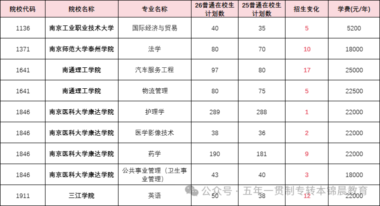 5.南京医科大学康达学院(护理学):招生计划新增 1 人(25 年 288→26 年 289)